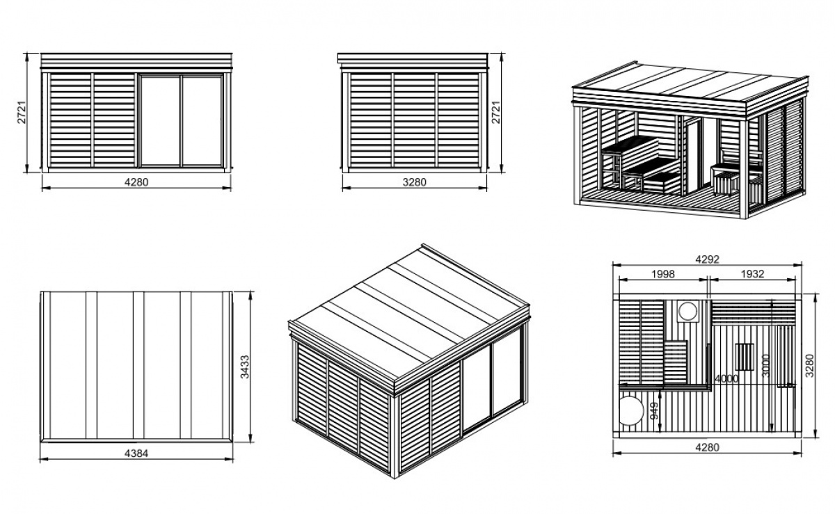 - Badstuepanelene er modulære (glasspaneler,paneler med vinduer, paneler med dører, paneler med trepersienner, skyvedører);