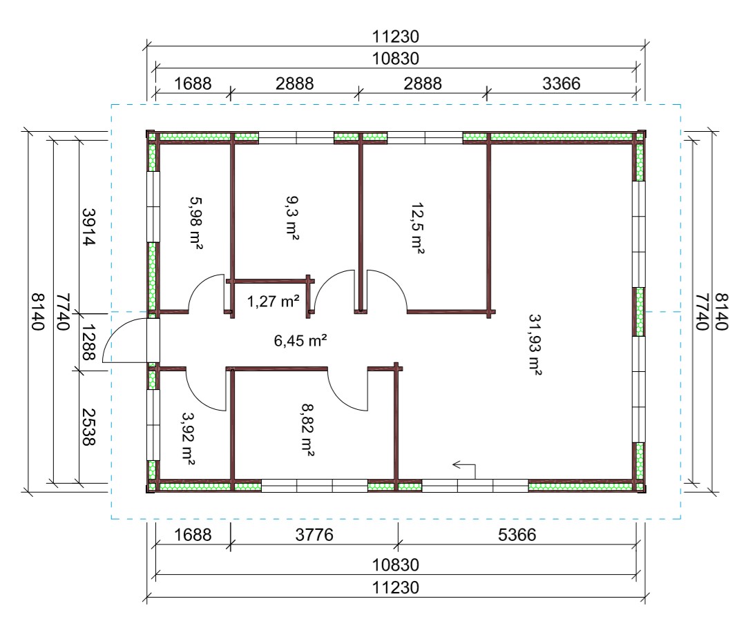 - Vegg isolering mulig på utsiden eller innsiden (treramme fylt med steinull eller ecowool, kledning med planker som imiterer tømmerstokker eller med andre typer materialer).