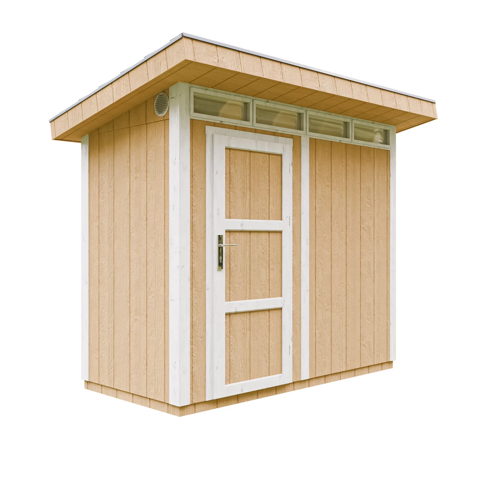 - Pakken inkluderer bitumen-shingeltak i grå farge, samt metallgesimser langs takets omkrets.
