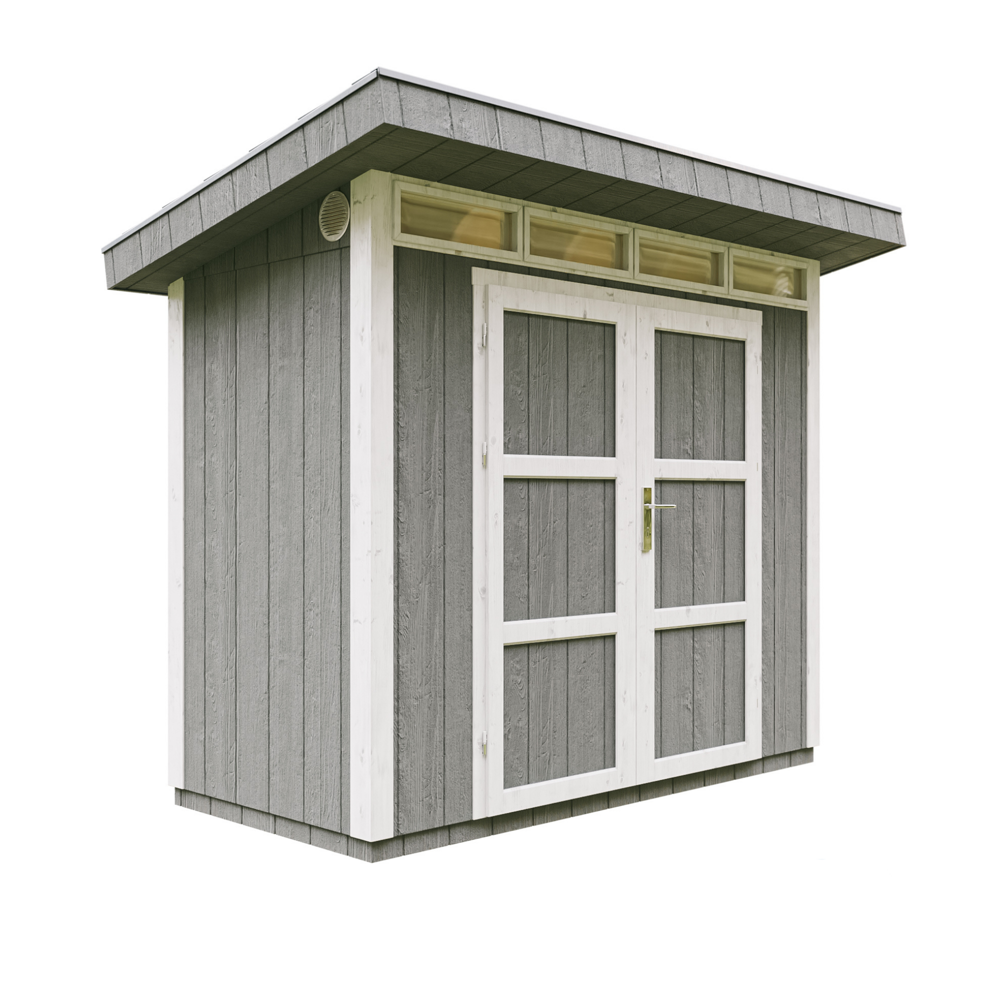 - Pakken inkluderer bitumen-shingeltak i grå farge, samt metallgesimser langs takets omkrets.