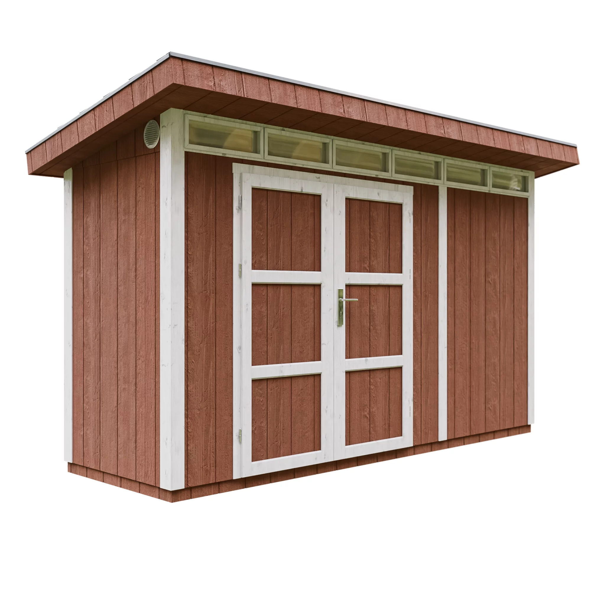 - Pakken inkluderer bitumen-shingeltak i grå farge, samt metallgesimser langs takets omkrets.