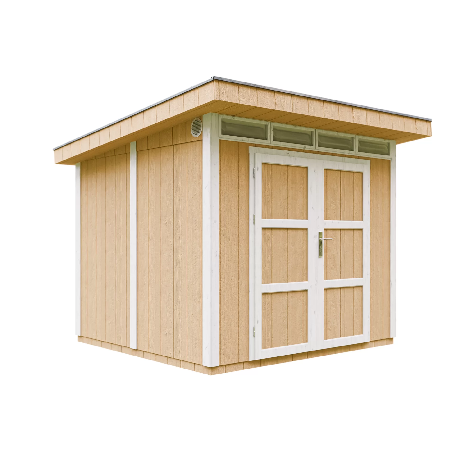 - Pakken inkluderer bitumen-shingeltak i grå farge, samt metallgesimser langs takets omkrets.