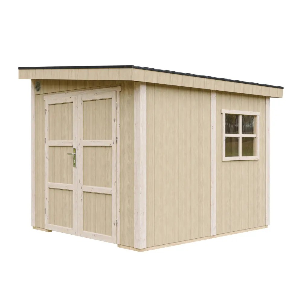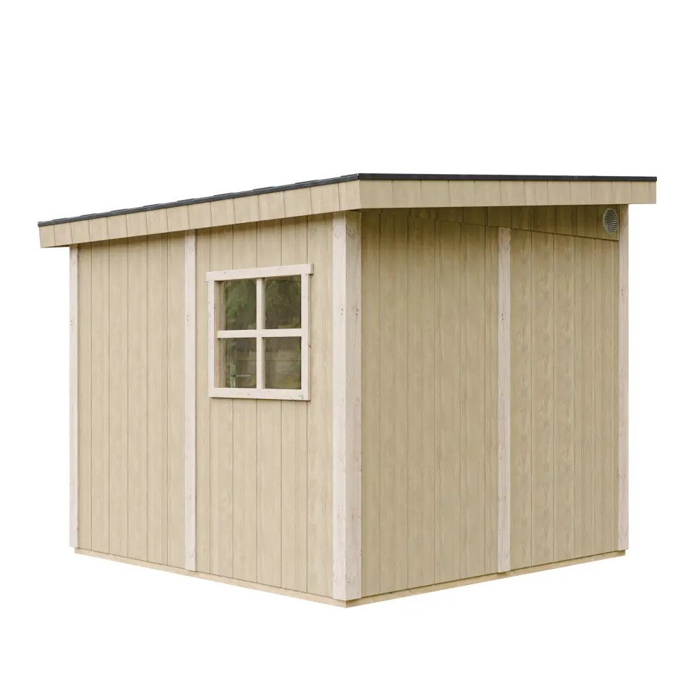 - Pakken inkluderer bitumen-shingeltak i grå farge, samt metallgesimser langs takets omkrets.