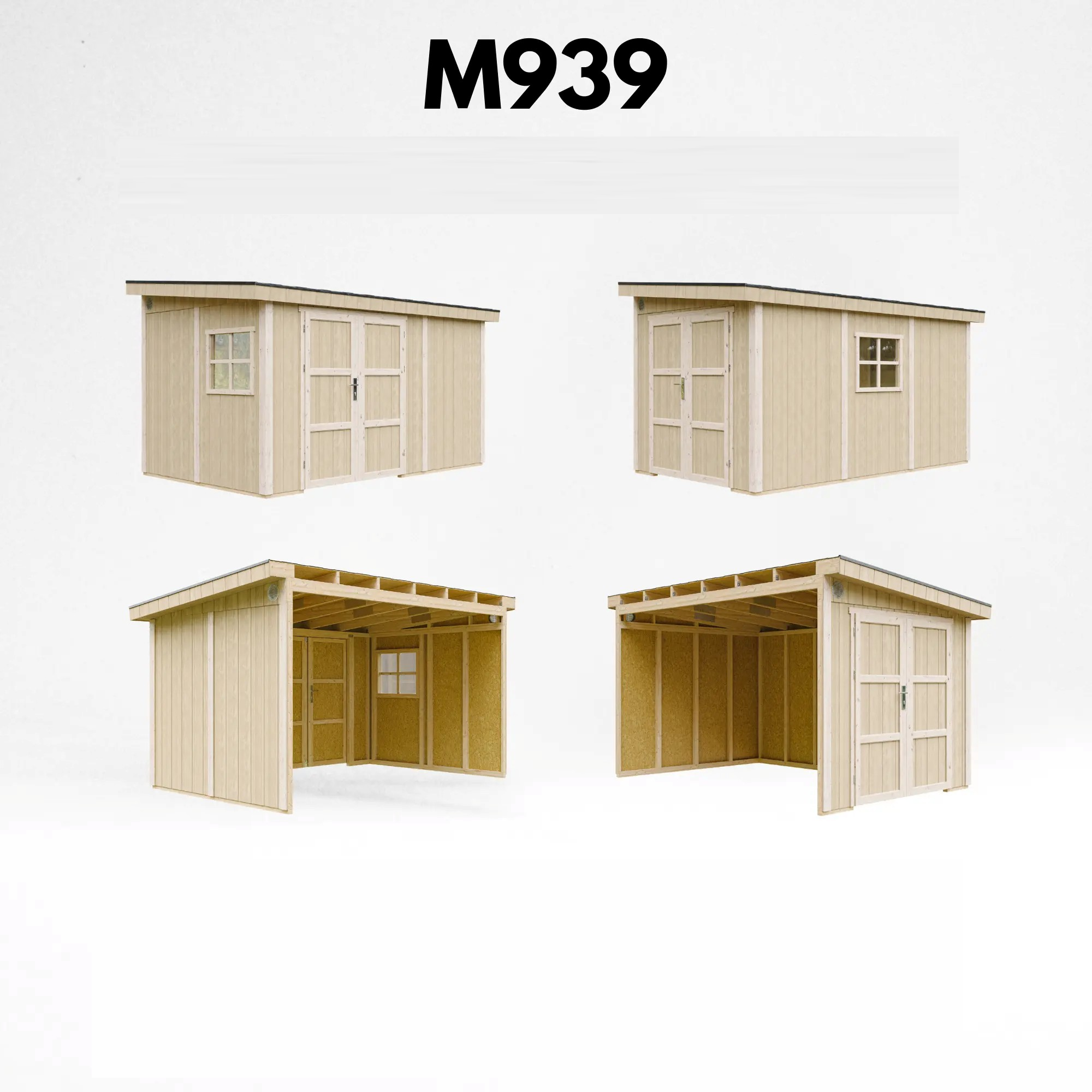 - Pakken inkluderer bitumen-shingeltak i grå farge, samt metallgesimser langs takets omkrets.