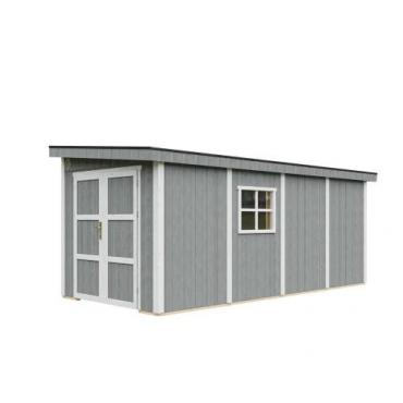 - Pakken inkluderer bitumen-shingeltak i grå farge, samt metallgesimser langs takets omkrets.