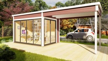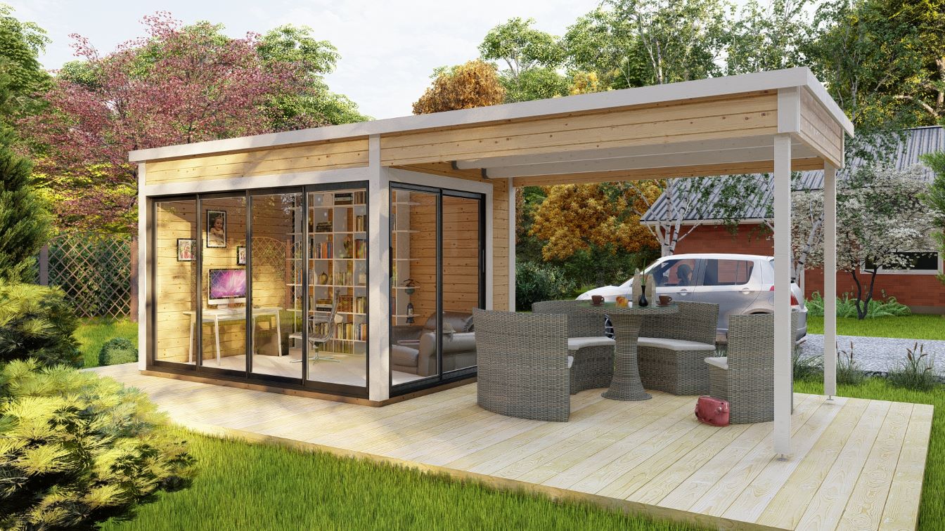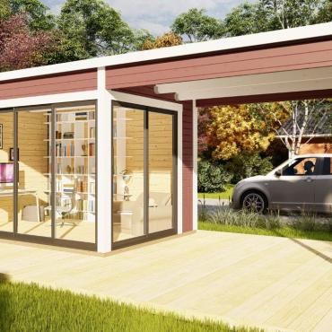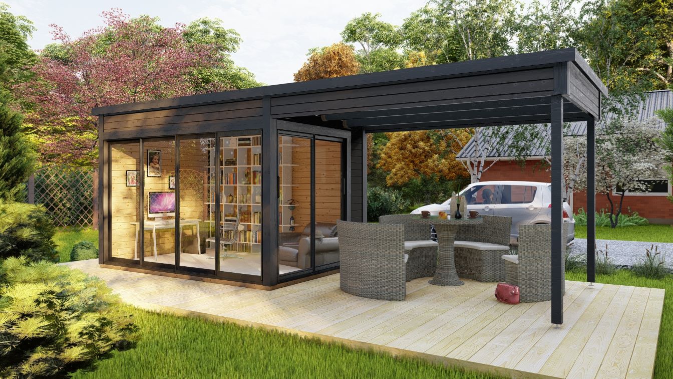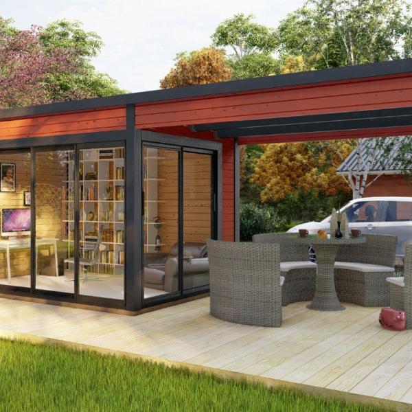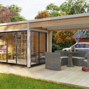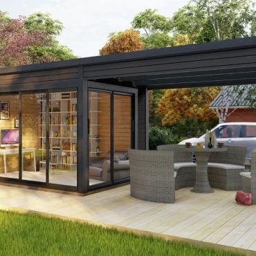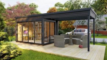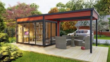 Hagekontor,lysthus, oransjeri - vår nye serie med moderne annekser med det bredeste bruksområdet! Dette luftige rommet med skyvedør lar deg nyte sommerens varme og sjarmerende dufter uten å forlate din favoritt loungestol eller sofa. I kaldt vær kan døren enkelt lukkes og blokkere vind og kulde ute, mens den fantastiske utsikten over hagen og området rundt forblir!