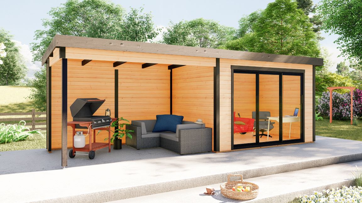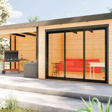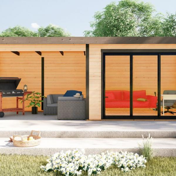 Hagekontor,lysthus, oransjeri - vår nye serie med moderne annekser med det bredeste bruksområdet! Dette luftige rommet med skyvedør lar deg nyte sommerens varme og sjarmerende dufter uten å forlate din favoritt loungestol eller sofa. I kaldt vær kan døren enkelt lukkes og blokkere vind og kulde ute, mens den fantastiske utsikten over hagen og området rundt forblir!