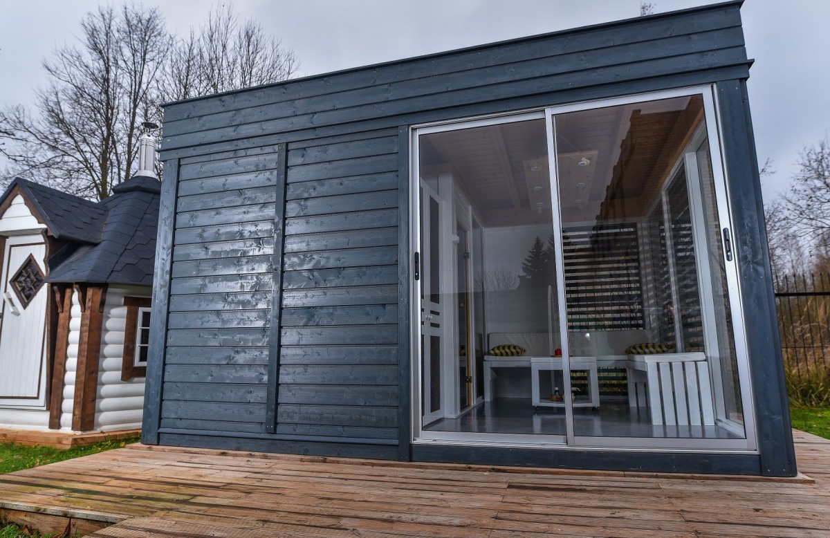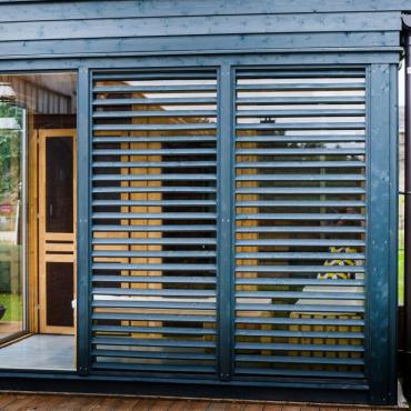 - Badstuepanelene er modulære (glasspaneler,paneler med vinduer, paneler med dører, paneler med trepersienner, skyvedører);