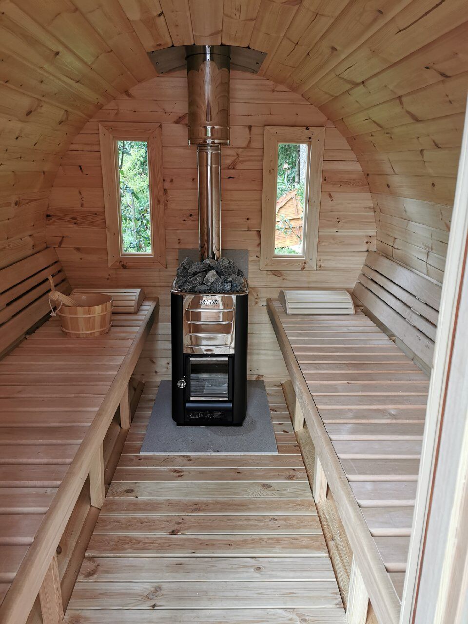 - Harvia Pro 20 vedovn (24,1 kW) vedlast fra innside, med pipe, steiner;