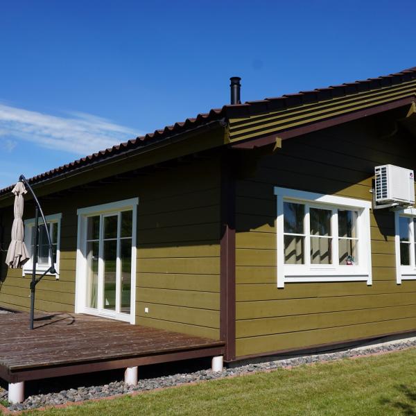- Limtre vinduer og dører med isolerglass. Dekorativ treramme innvendig og utvendig;