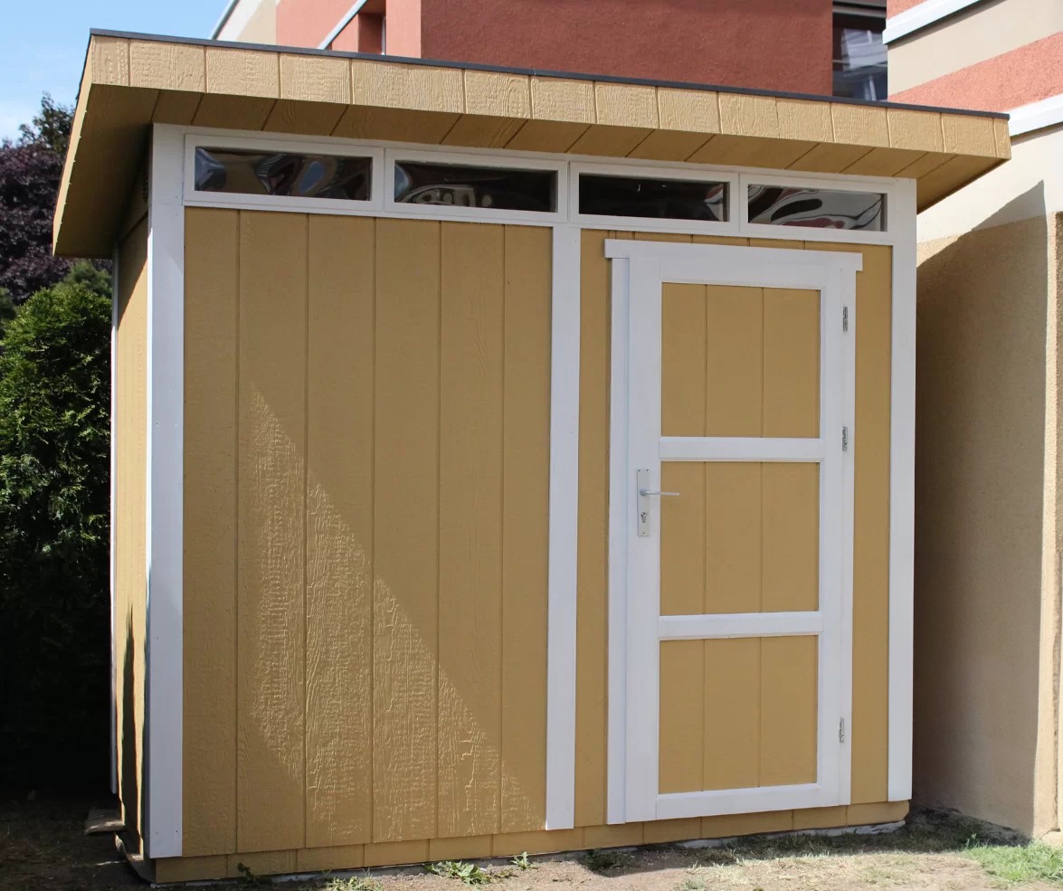 - Pakken inkluderer bitumen-shingeltak i grå farge, samt metallgesimser langs takets omkrets.