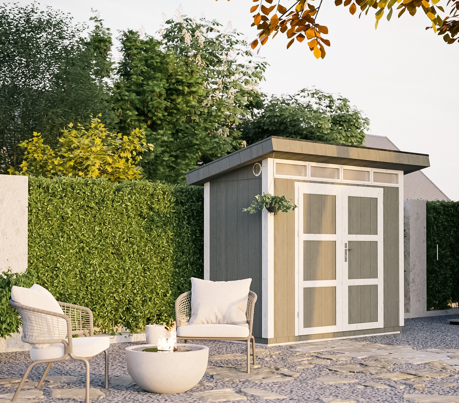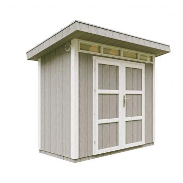 - Pakken inkluderer bitumen-shingeltak i grå farge, samt metallgesimser langs takets omkrets.