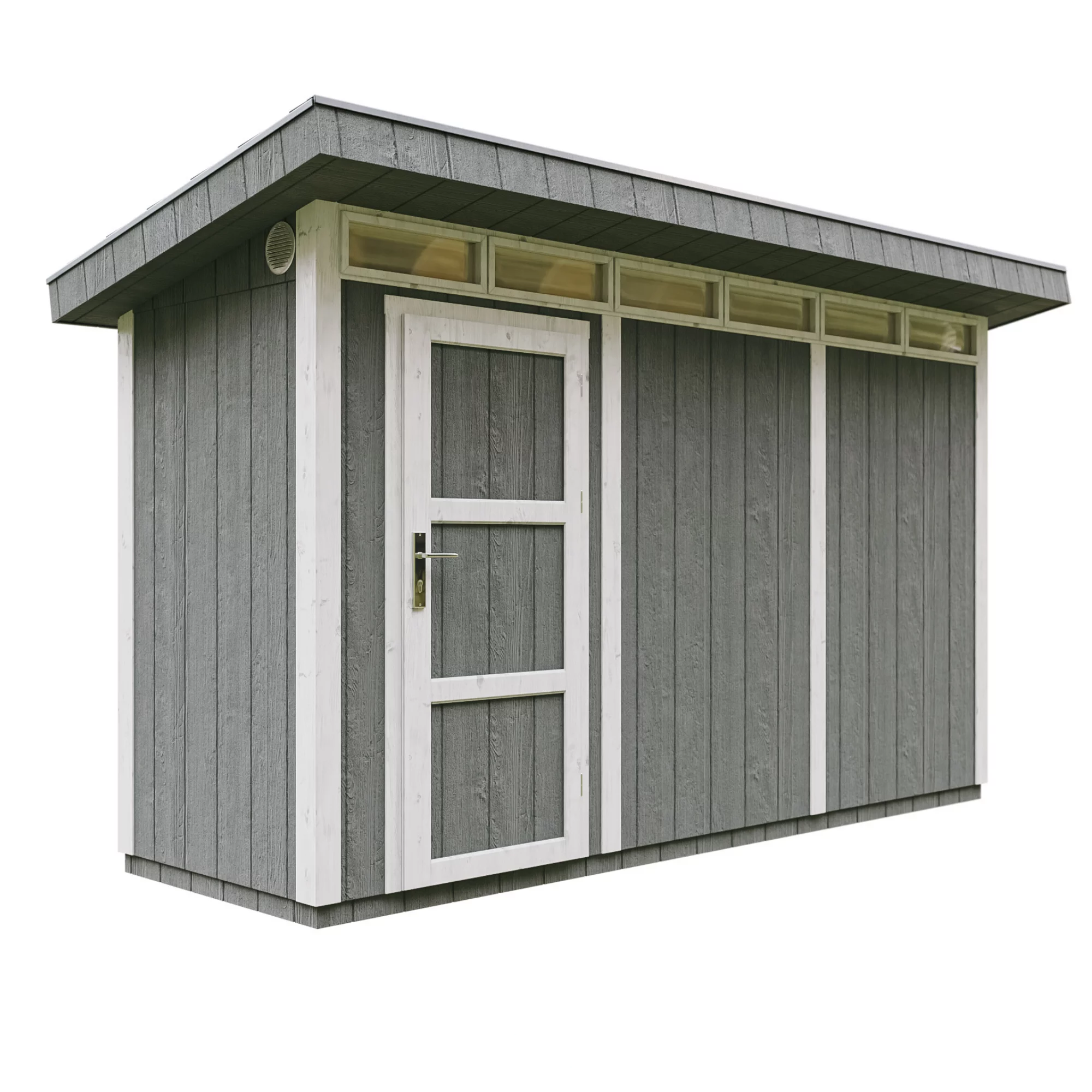 - Pakken inkluderer bitumen-shingeltak i grå farge, samt metallgesimser langs takets omkrets.