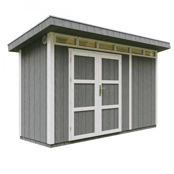 - Pakken inkluderer bitumen-shingeltak i grå farge, samt metallgesimser langs takets omkrets.