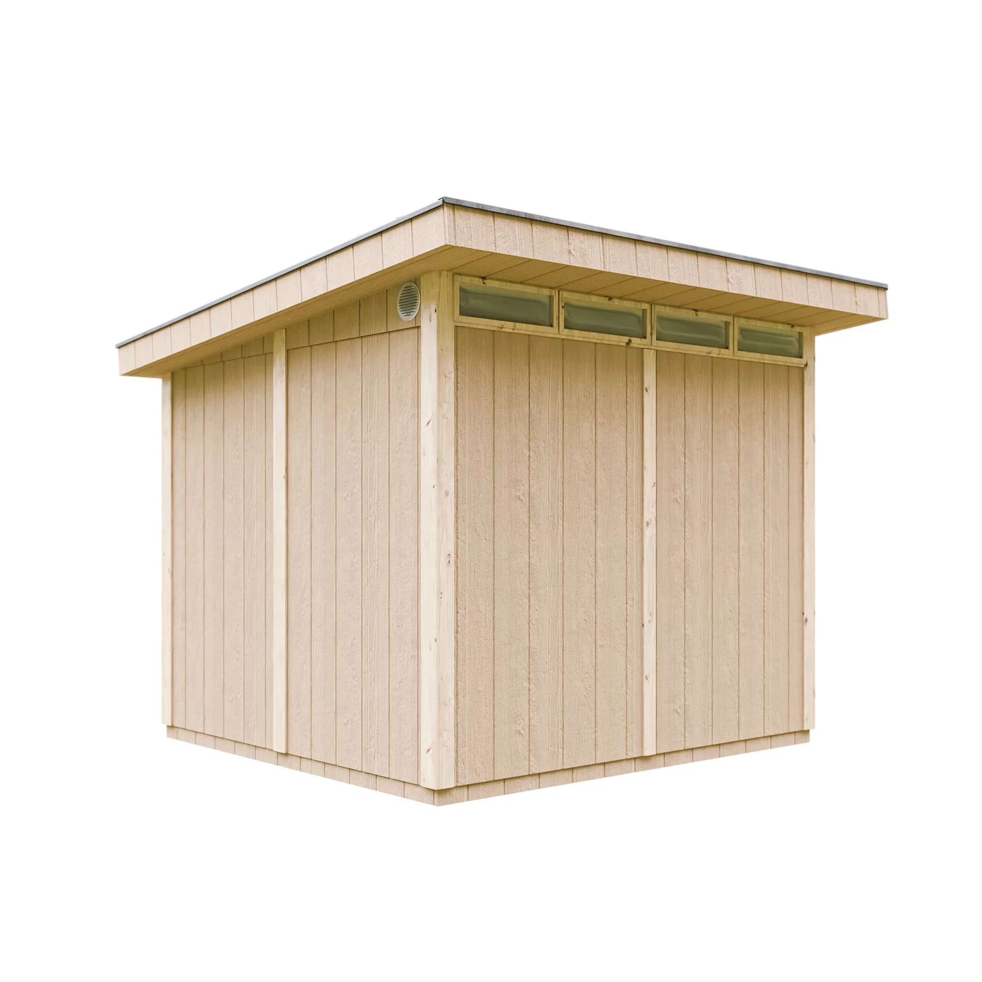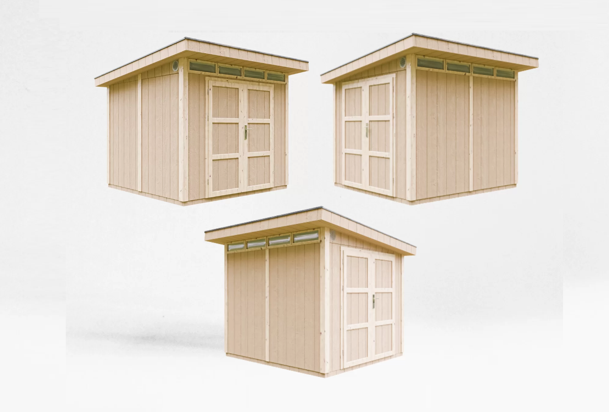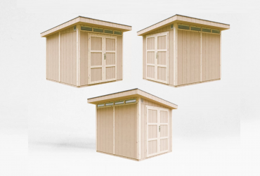 - Pakken inkluderer bitumen-shingeltak i grå farge, samt metallgesimser langs takets omkrets.
