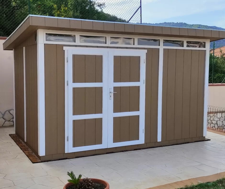 - Pakken inkluderer bitumen-shingeltak i grå farge, samt metallgesimser langs takets omkrets.