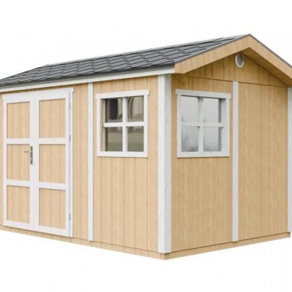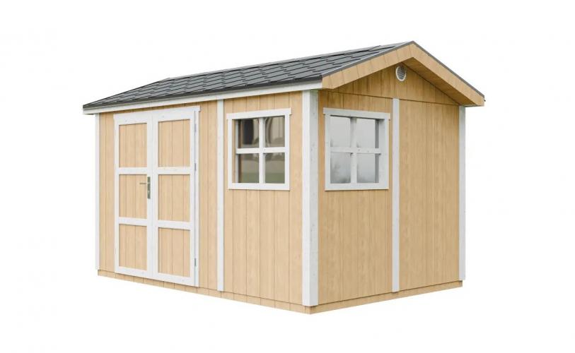 - Pakken inkluderer bitumen-shingeltak i grå farge, samt metallgesimser langs takets omkrets.