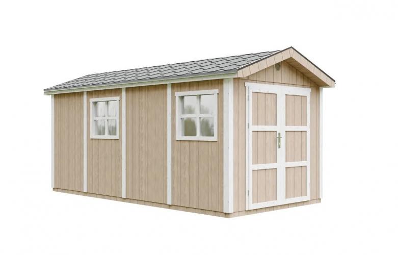 - Pakken inkluderer bitumen-shingeltak i grå farge, samt metallgesimser langs takets omkrets.
