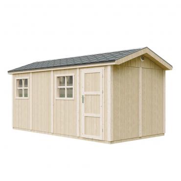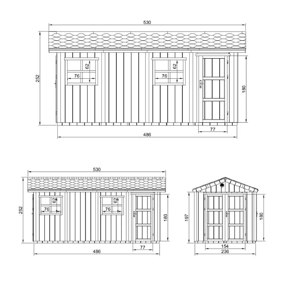 - Pakken inkluderer bitumen-shingeltak i grå farge, samt metallgesimser langs takets omkrets.